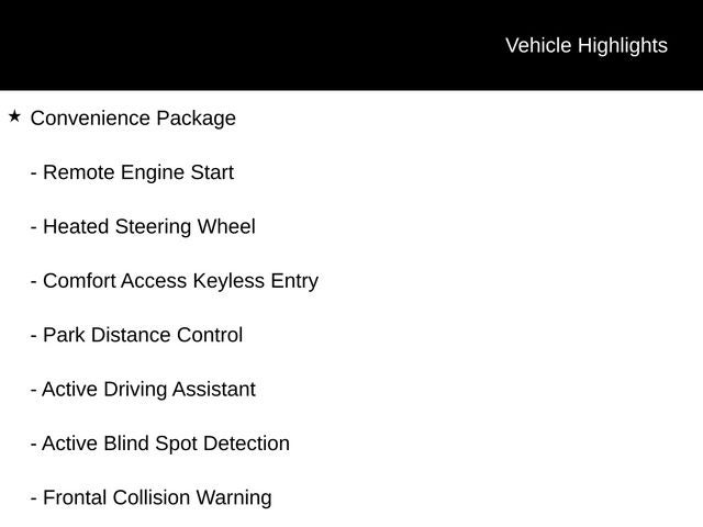 - CONVENIENCE PACKAGE: Remote Engine Start, Lane Departure Warning, Comfort Access Keyless Entry, Heated Steering Wheel, Active Driving Assistant, and more